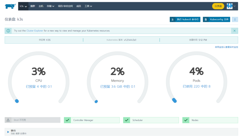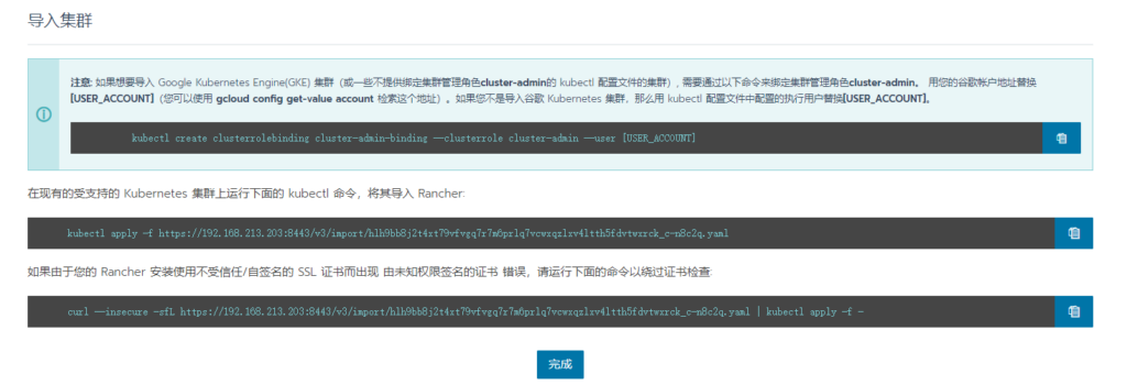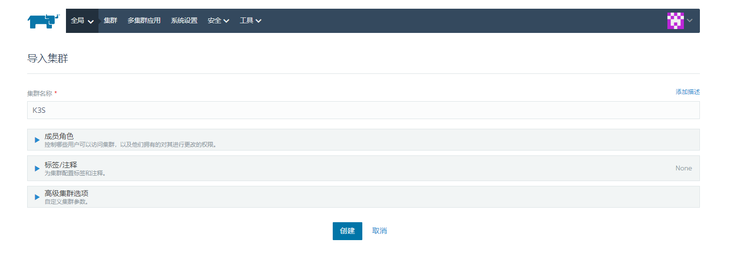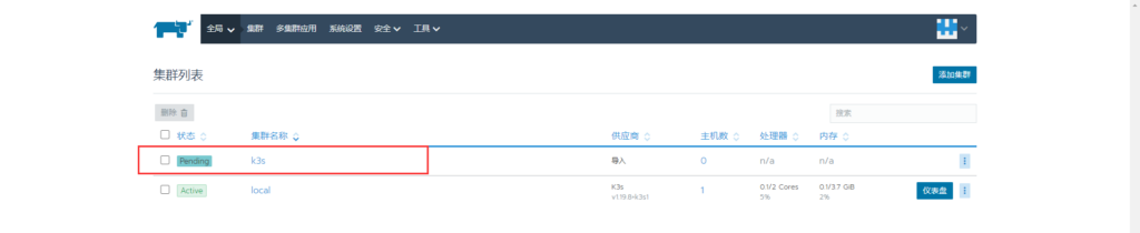 出现这个提示说明Rancher已经收到K3S的注册请求,正在完成K3S集群的注册工作,再等数十秒种的时间即可完成K3S集群的导入工作:等待中