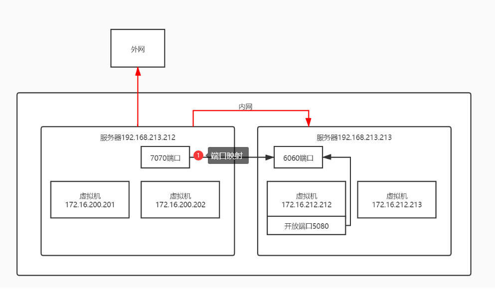 192.168.213.212服务器拥有外网权限,并开放了7070端口。此时在外网环境下需要访问到192.168.213.213服务器的6060端口,就需要在212服务器上做端口映射。将7070端口转发到213服务器的6060端口。