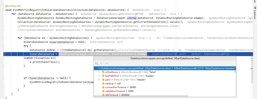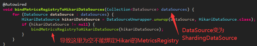 那么如何解决这个问题呢,我们可以模仿这个DataSourcePoolMetricsAutoConfiguration的逻辑,为Sharding内的dataSources进行循环绑定。