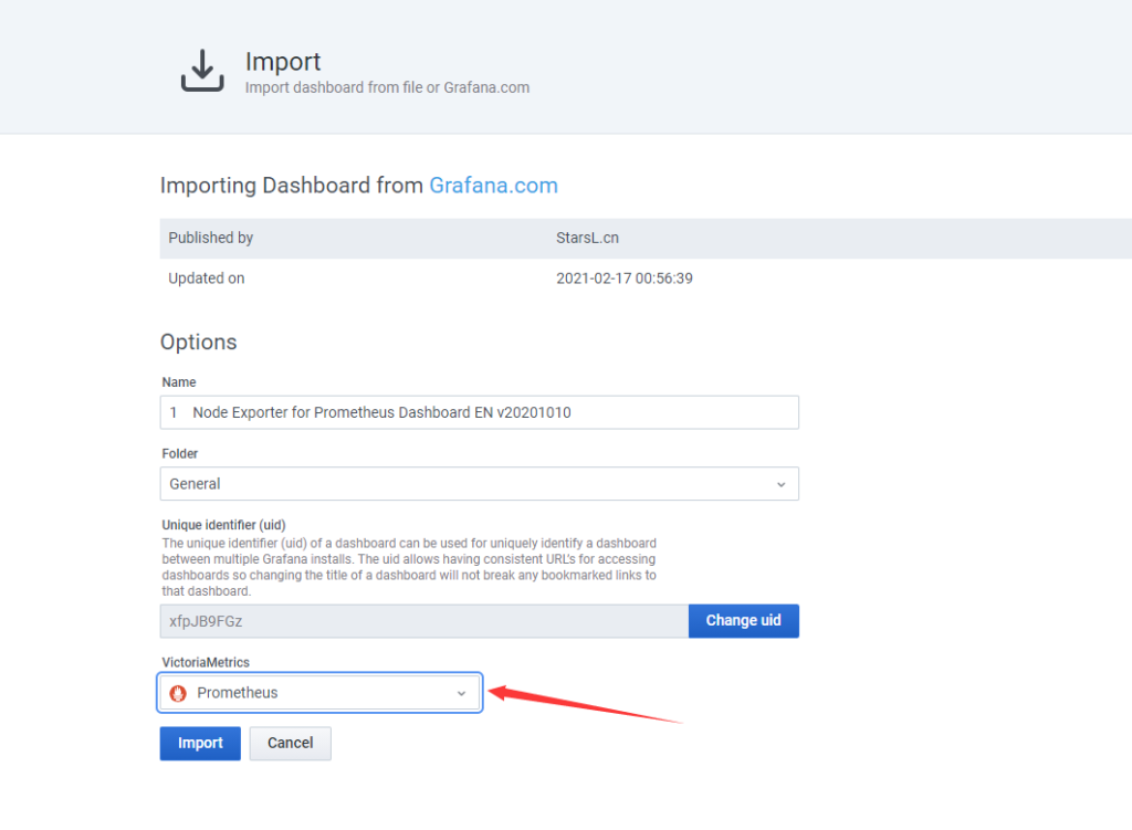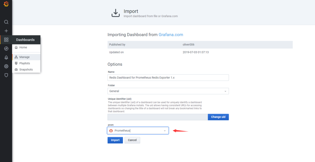 访问Grafana,ID:763,选择数据源导入