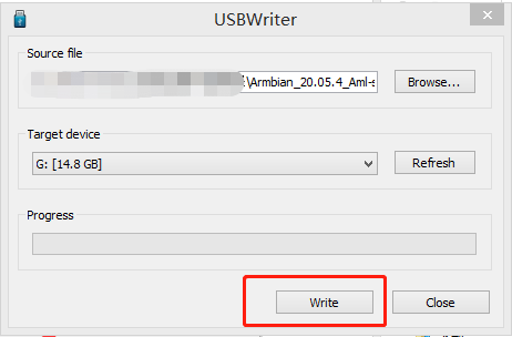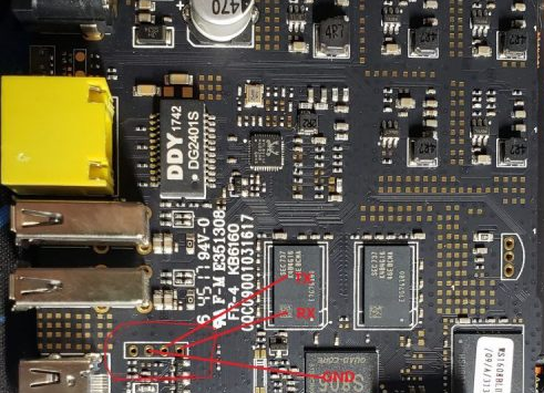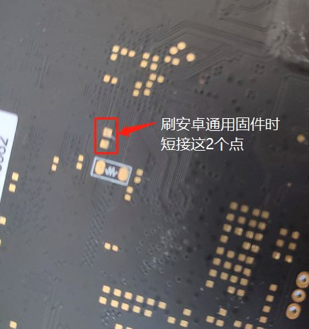 用准备好的摄子或其他短路工具,玩客云背面短接图中2点后,不要松手,再给玩客云通电,软件上有动静后,松开摄子.至烧录成功. 点击”停止”,退出软件,拔下USB公头线,断电玩客云,放到一边备用.