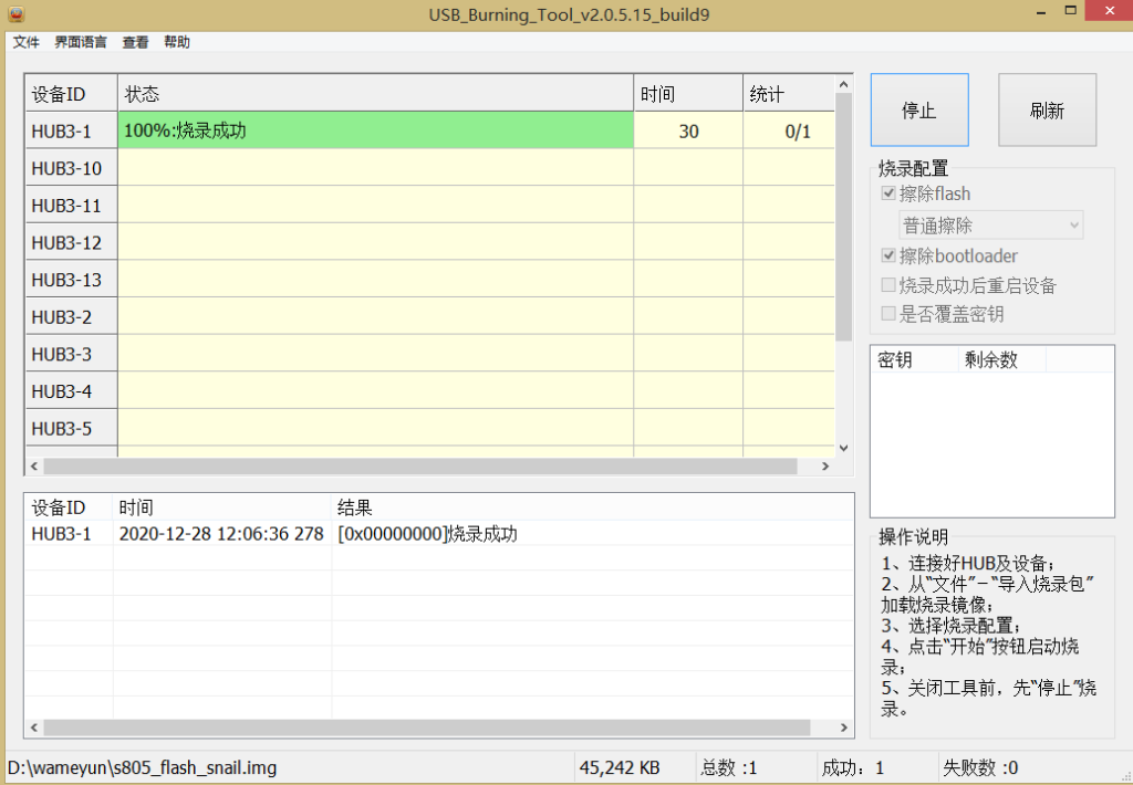 拆机,将玩客云主板取出,用USB公对公线,一头连接在玩客云2号USB口,一头连接在电脑上,玩客云暂时不要通电.电脑上安装好USB_Burning_Tool,运行软件,导入烧录包s805_flash_snail.img勾选上”擦除flash””擦除bootloader”,点击”开始”.