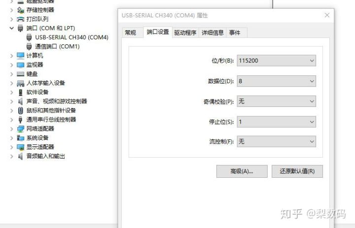 第一次使用的话先装好驱动,然后去设备管理器里查看 COM 口序号,我这是 COM4,并且把设备属性里的位/秒改成 115200,流控制设定为无